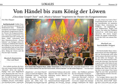 ![]() | Chocolate Gospel Choir und Musica Salutare in Bad Reichenhall10.01.2026 Bei Puccinis „Nessun Dorma“ konnten Adelheid ... mehrAbt und Co. ihr Können unter Beweis stellen – das Publikum quittierte das mit stehenden Ovationen...... |