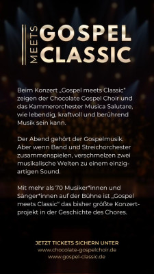 Gospel meets Classic verbindet Klassik und Gospel mit einem 45-köpfigen Chor, 6-köpfiger Band und 15 Streichern unter Leitung von Klaus Eddy Ackermann und Adelheid Abt – ein unvergessliches Konzerterlebnis!